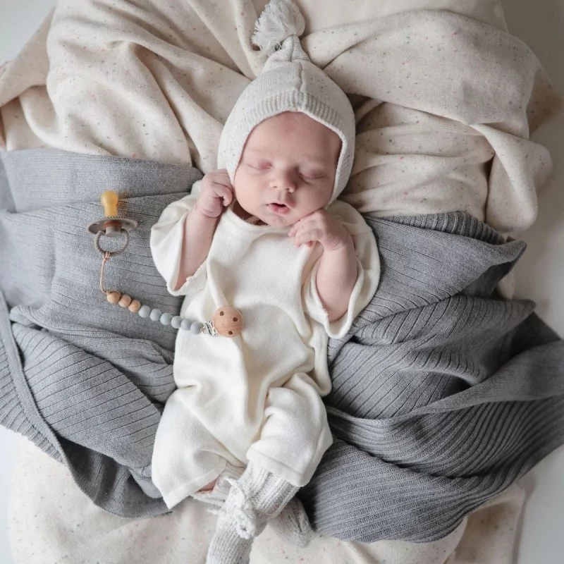 Hou je baby warm en knus in het gebreide deken van Mushie in verschillende designs.